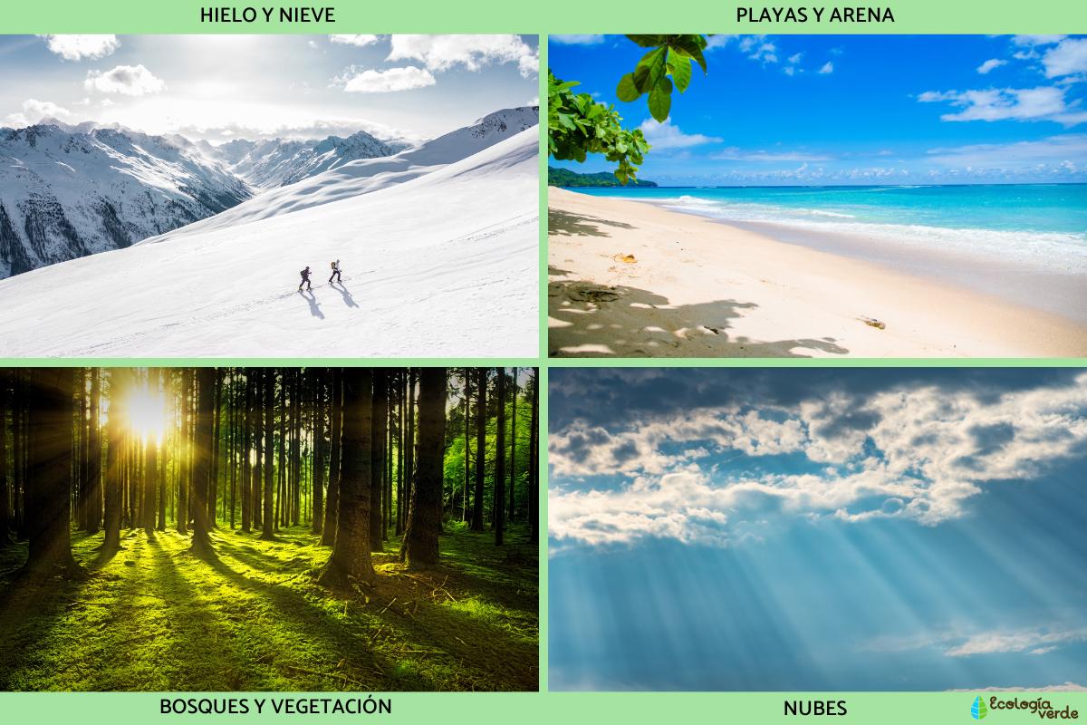 - Playas y arena: aunque no son tan reflectantes como la nieve, aún reflejan una cantidad significativa de radiación solar, lo que ayuda a mantener temperaturas más frescas en las zonas costeras.