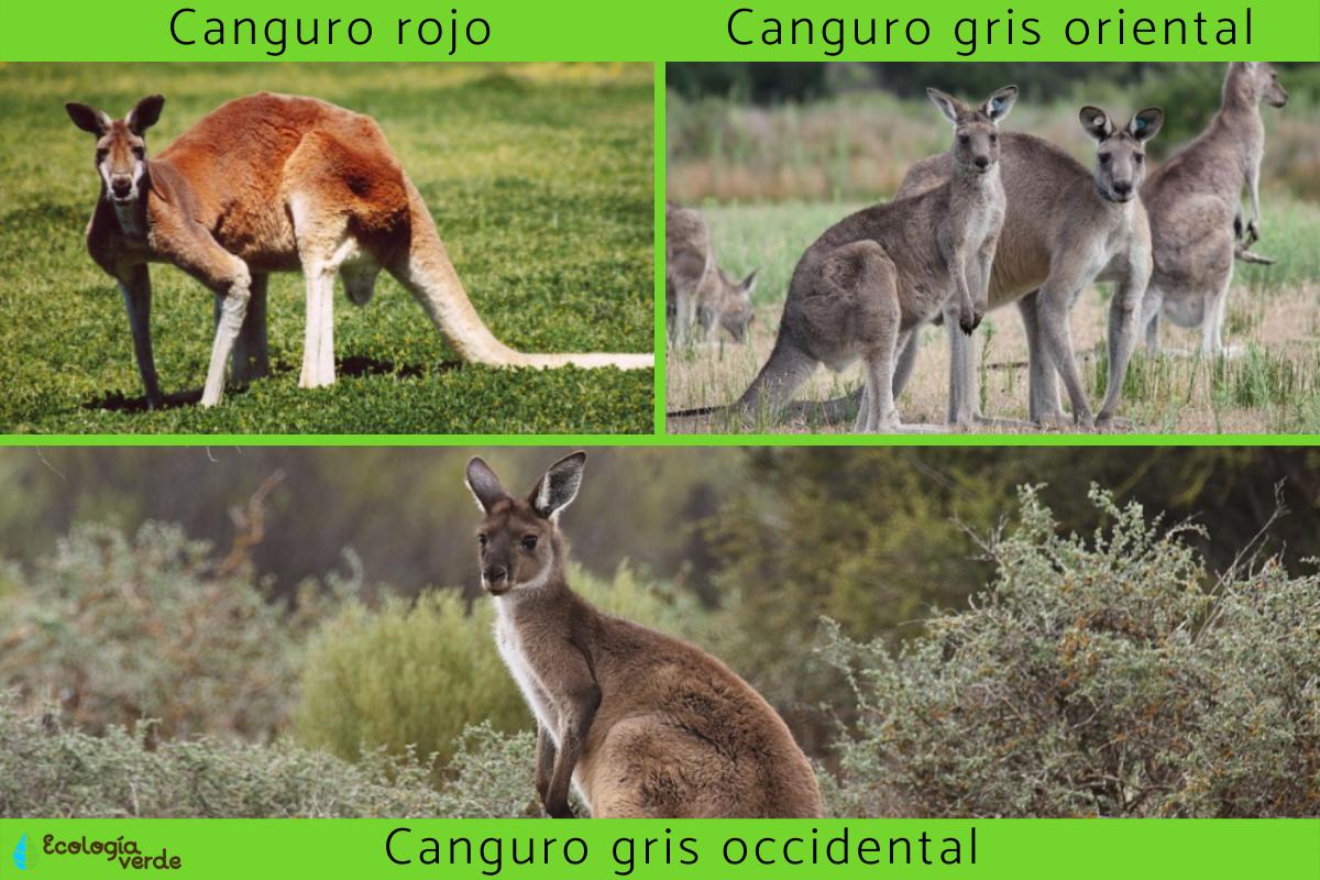 - Canguro gris oriental, canguro gigante o Macropus giganteus: es ligeramente más pequeño que el canguro rojo aunque la diferencia es pequeña, habita la zona este del país.