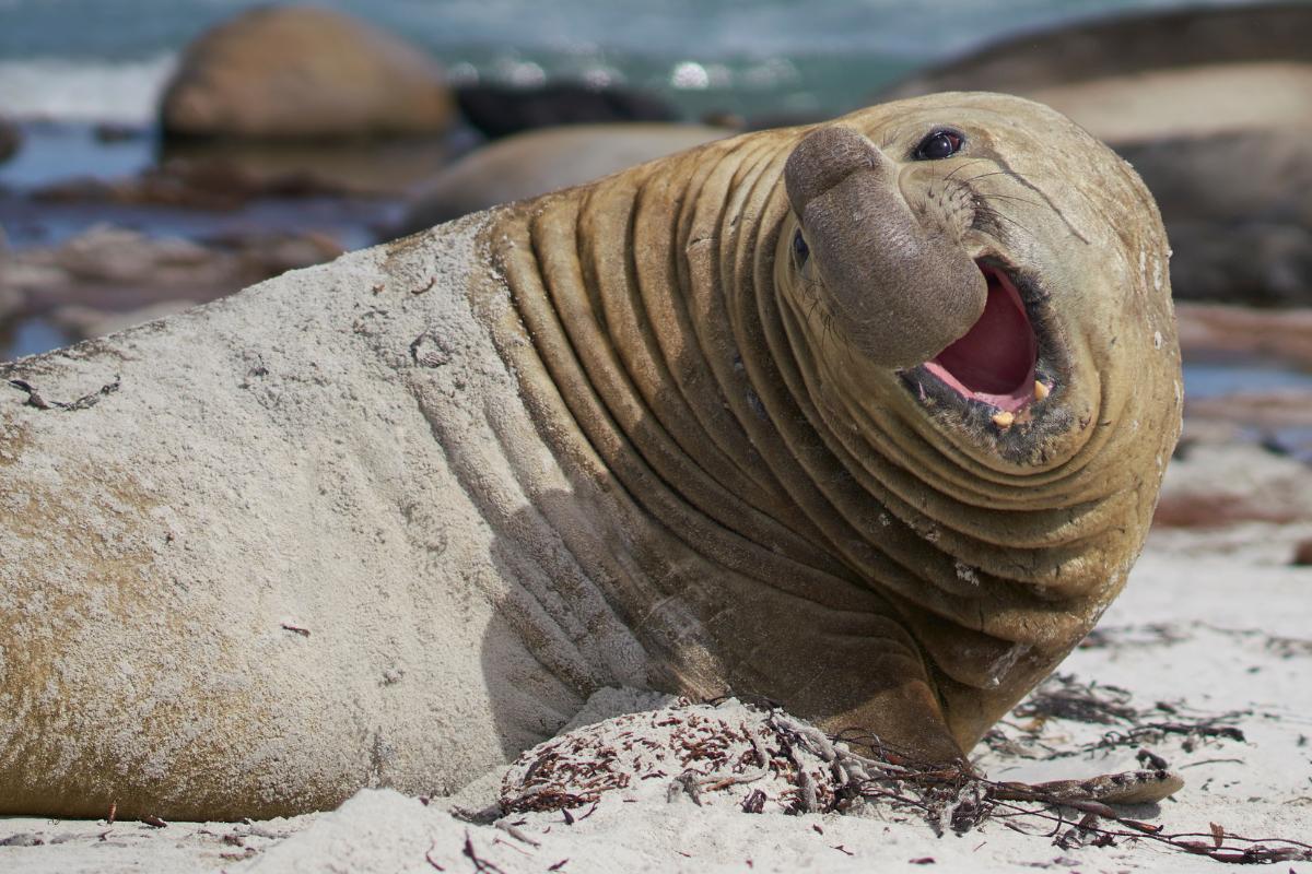 Uno de los animales marinos más sociables en la playa es el elefante marino, también conocido como foca elefante. Es un género de mamíferos pinnípedos, es decir, que tiene patas en forma de aletas, de nombre científico Mirounga. Son animales muy grandes, pues pueden pesar varias toneladas, y viven tanto en el hemisferio norte como en el sur.
