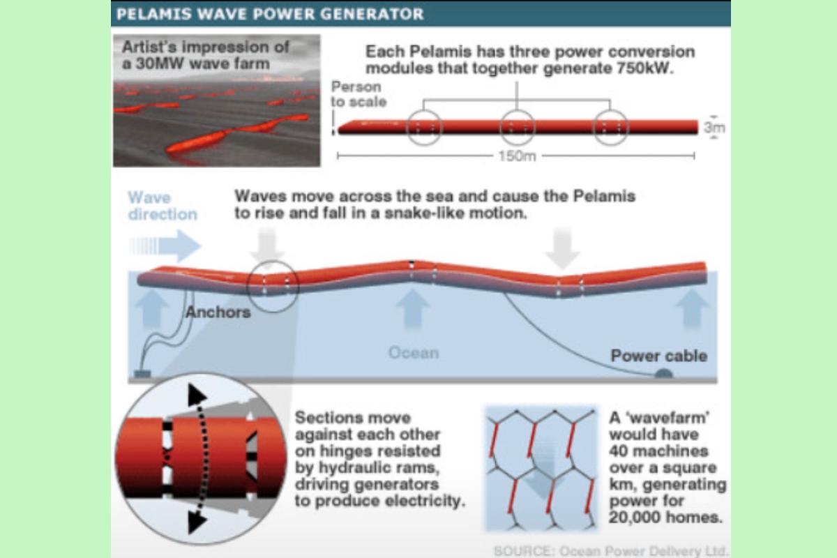 El sistema Pelamis se compone de varios segmentos conectados que se asemejan a una serpiente flotante. Al moverse con las olas, los segmentos se flexionan y comprimen generadores hidráulicos situados en las uniones, generando electricidad.