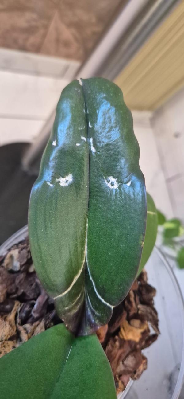 Cuando las hojas verdes de las orquídeas presentan manchas circulares color café y un olor desagradable, hay un asentamiento de bacterias del género Erwinia spp. Estas bacterias se extienden bastante rápido, y se potencia en las condiciones particulares húmedas de las orquídeas. Puede consumir la planta en pocos días, así que se le debe dar tratamiento inmediato.