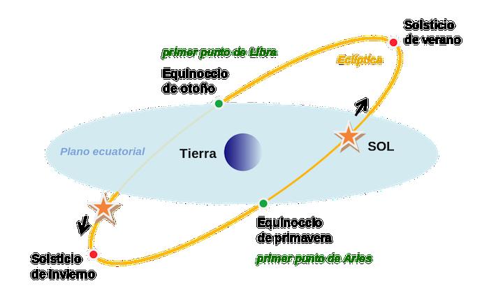 Durante los equinoccios el Sol se ubica en uno de los dos puntos de la esfera o bóveda celeste donde el ecuador celeste (un círculo en el mismo plano que el ecuador, es decir, la proyección del ecuador terrestre en la esfera celeste) y la eclíptica se cruzan.