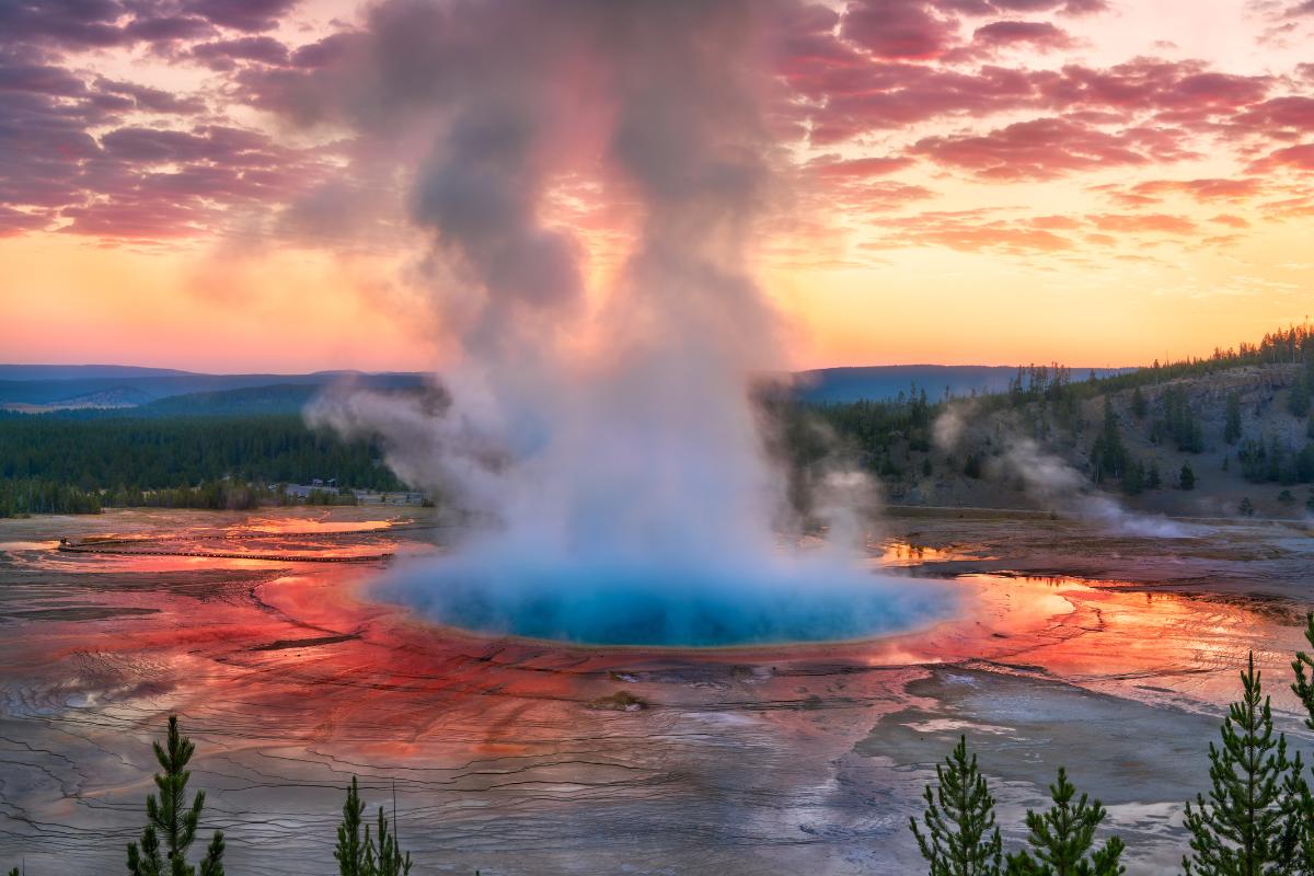 - Parque Nacional Yellowstone, EE.UU.: un medio geográfico protegido destinado a la conservación de la fauna y la flora, así como las formaciones geológicas únicas como los geiseres y numerosas surgencias de aguas termales.