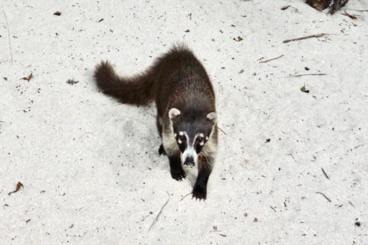 Similar al mapache, existe también este coatí endémico de Cozumel. Son buenos para escalar árboles y es común verlos en las playas. Son de color pardo y tienen el hocico alargado de color blanco. Así como el mapache de Cozumel, también presentan enanismo isleño, lo que quiere decir que son más pequeños que aquellos coatís que viven tierra adentro.