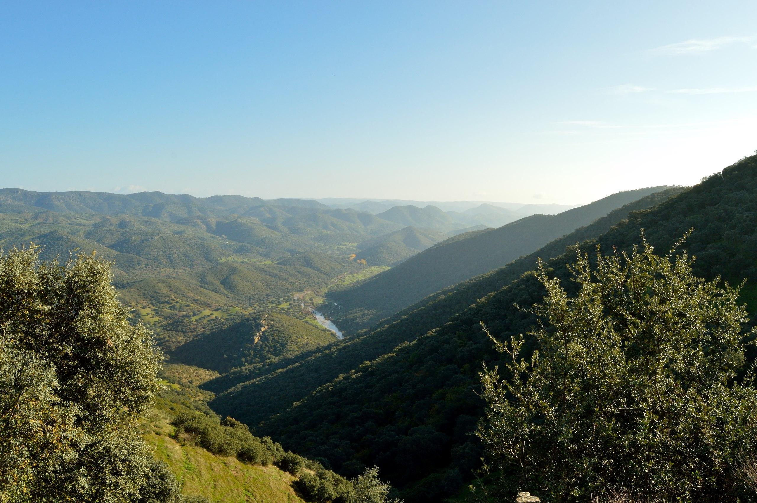 - Sierra Morena: una de las principales estribaciones de la Meseta Central. Destaca por sus ricos yacimientos minerales, incluyendo hierro, cobre y plomo, y por su complejo montañoso que incluye materiales como pizarras, cuarcitas y rocas volcánicas. También es conocida por sus densos bosques mediterráneos de encinas y alcornoques, y por ser hábitat del lince ibérico, una especie emblemática y en peligro de extinción.