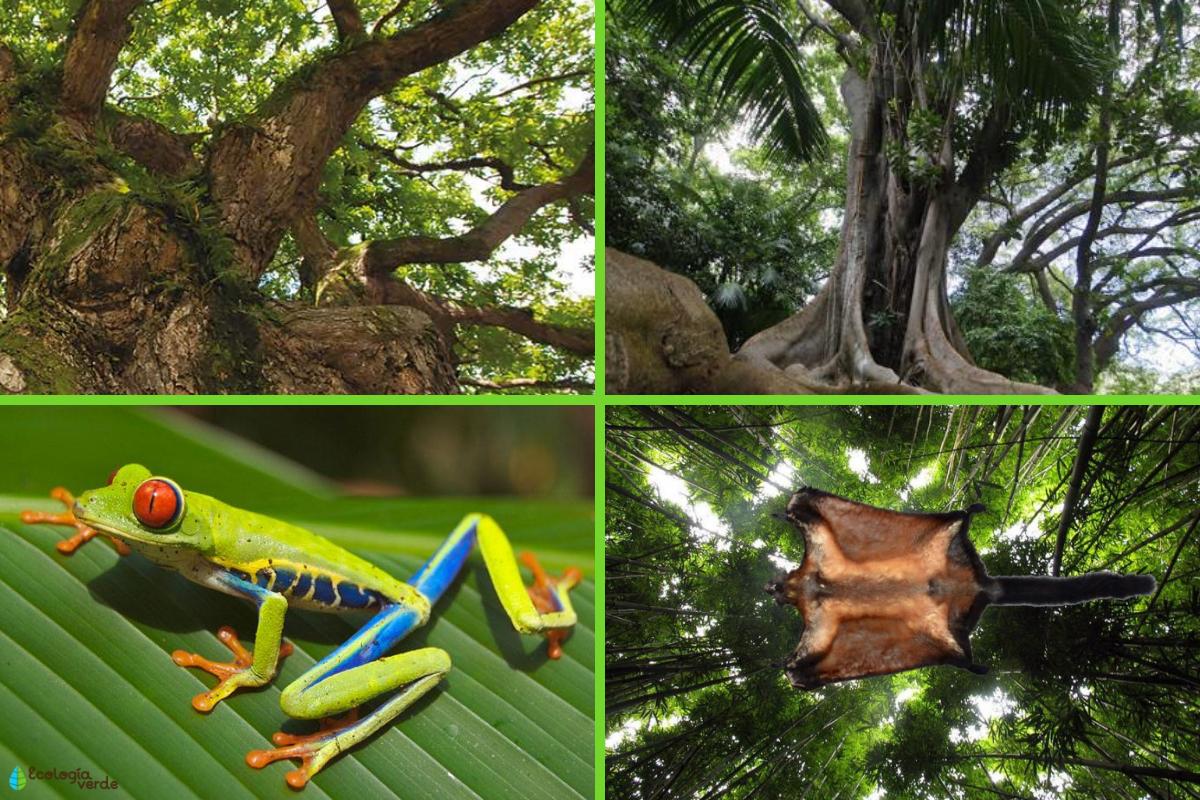 - El dosel o zona conopial donde, al igual que en la zona emergente, destacan las lianas (plantas que enraízan en el suelo y se aprovechan de otras para crecer) y las epífitas (plantas que viven sobre otras sin enraizar en el suelo) de bromeas, lirios u orquídeas, aunque los árboles son más pequeños y más tupidos (especies del género Ficus), impidiendo así el paso de luz a estratos inferiores. Además, cabe destacar que algunos de ellos presentan hojas con punta alargada para facilitar los fenómenos de escorrentía durante las abundantes precipitaciones.