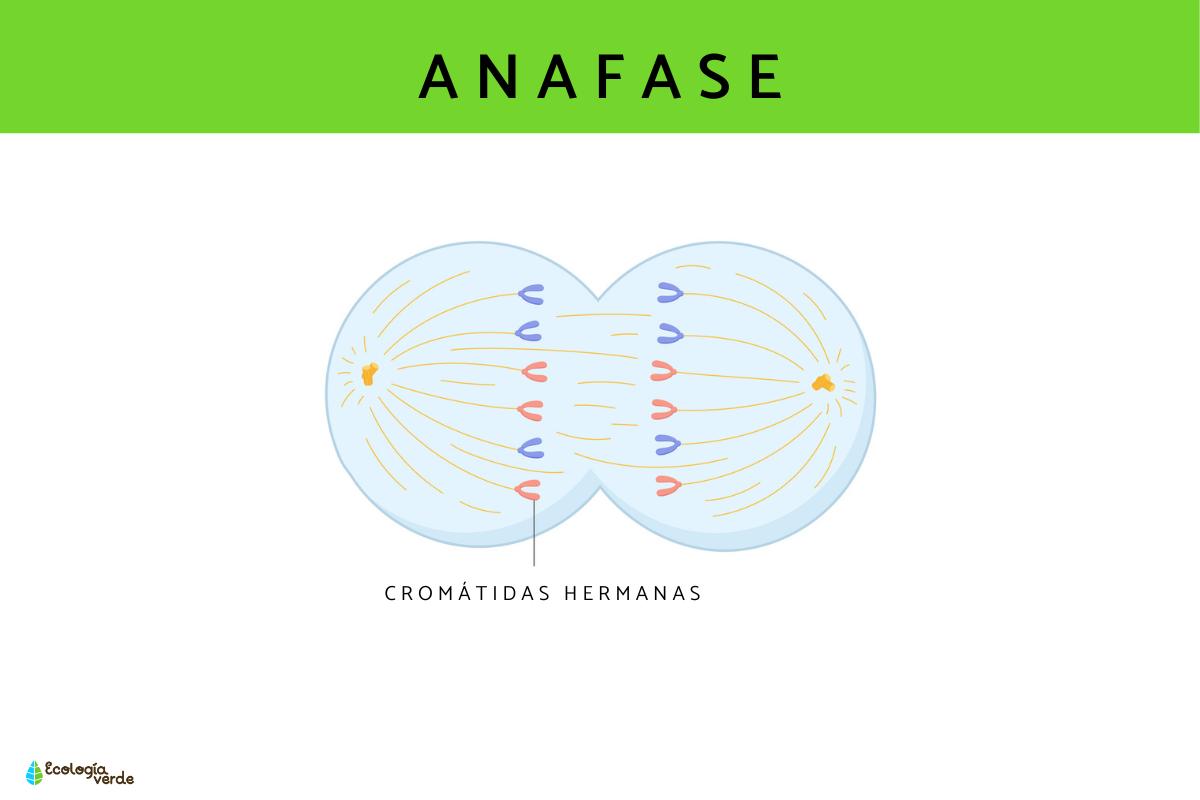 En la anafase las cromátidas hermanas de los cromosomas duplicados se separan por completo y migran hacia los respectivos polos opuestos de la célula para que ambas células hijas puedan heredar una copia de cada cromosoma. Esto ocurre gracias a que las proteínas cohesionas que unen a las cromátidas hermanas se degradan y a la acción de los microtúbulos o fibras del huso mitótico que se anclan a los cinetocoros de cada cromosoma.