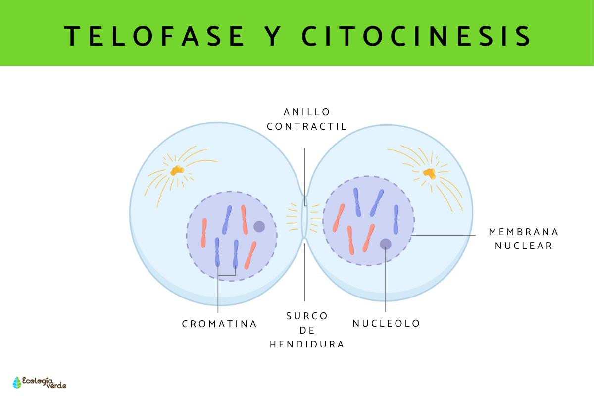 Una vez que los juegos completos de cromosomas están ubicados en cada uno de los polos de la célula, estos se alargan y descomprimen nuevamente para adoptar su antigua forma de hilos. También desaparece el huso mitótico y se forma el nucléolo y la membrana celular de cada nueva célula hija.