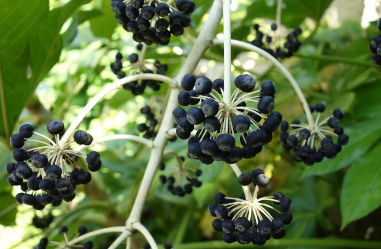 Su floración da lugar a umbrelas de flores blanco-verdosas, muy menudas y que recuerdan en gran parte a las de la hiedra por lo poco llamativas o vistosas que son. Estas, a su vez, dan lugar a los frutos, unas bayas oscuras y redondeadas. La floración suele presentarse en otoño aunque cultivada en interior es más difícil llegar a verla.