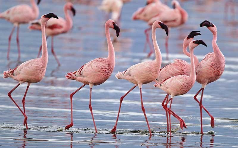 La especie más pequeña de flamenco se alimenta con apenas 60 g al día. El flamenco contiene en su lengua carnosa unos mecanismos que filtran el alimento que contiene en su interior gran cantidad de agua, ingiriendo solamente lo que es necesario y sacando el exceso de líquido.