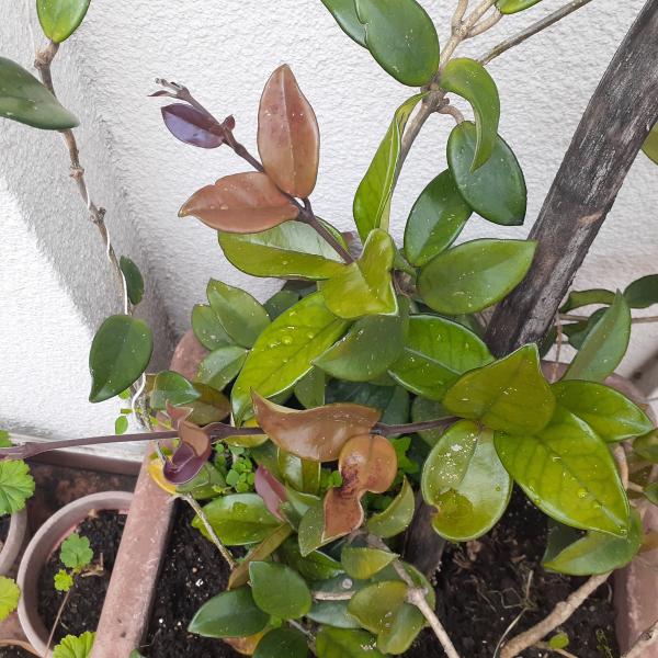 Tengo esta planta de cera desde hace diez años en el exterior donde no le da el sol directo. Siempre estuvo bien. Este año les ha empezado a salir esas hojas marrones que luego se vuelven verdes. Le puse agua oxigenada por si tenía algún problema. Le puse nutrientes naturales. Fertilizante. No sé qué hacerle. Les agradecería su opinión.
