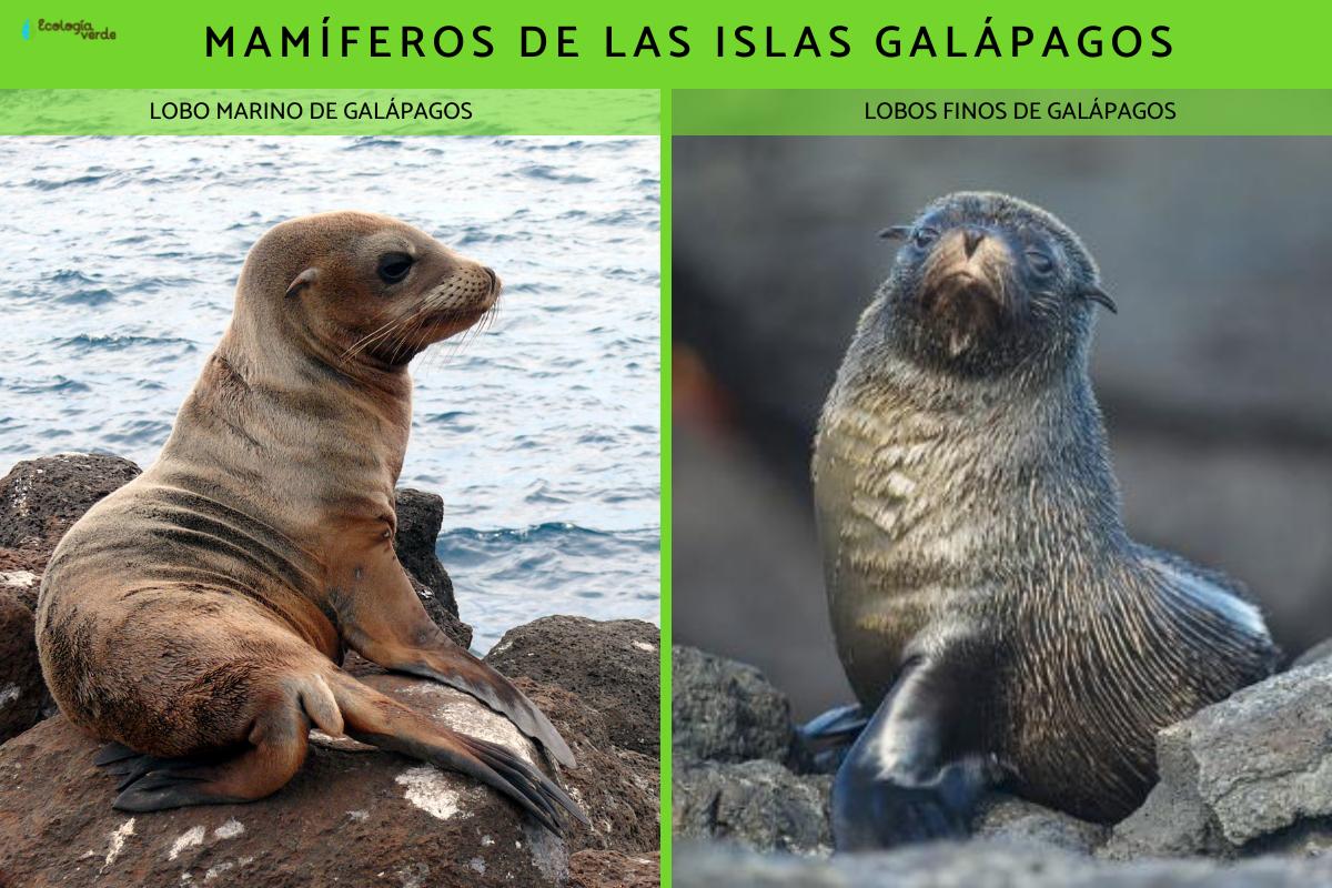 El león o lobo marino de Galápagos (Zalophus wollebaeki), con una población total de hasta 50.000 ejemplares que habitan las costas volcánicas del archipiélago; y los lobos peleteros de las Galápagos o lobos finos de Galápagos (Arctocephalus galapagoensis), animales nocturnos que se alimentan en aguas profundas y que generalmente no migran.