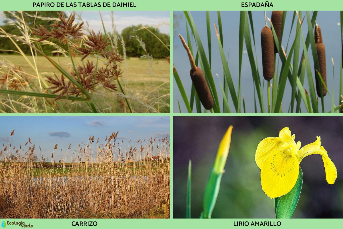 - Vegetación acuática: estos ecosistemas están poblados por una amplia variedad de plantas acuáticas, como la espadaña, el carrizo y el lirio amarillo. Estas especies se adaptan a las fluctuaciones estacionales del nivel del agua y proporcionan hábitats vitales para la fauna acuática. Conoce aquí las Plantas acuáticas: nombres y características.