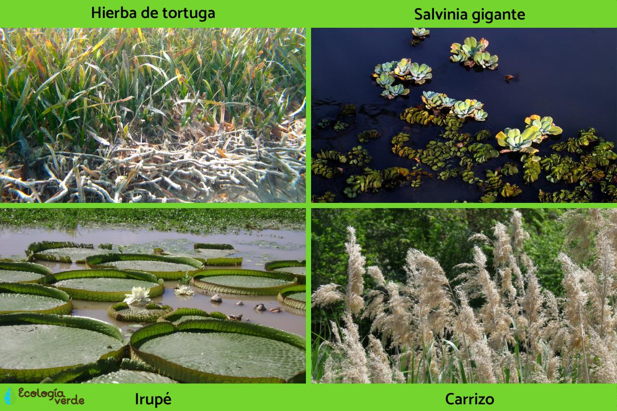 - Plantas flotantes: presentan las raíces libres sumergidas en el agua. La salvinia gigante (Salvinia molesta) es un ejemplo de este tipo de plantas que se encuentran en humedales palustres.