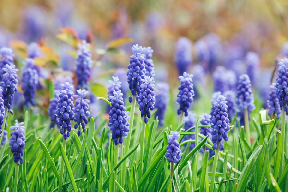 Crecen a muy poca altura, pero no por eso menos llamativas. Estas flores destacan porque son globosas, casi como si fuera un fruto, apenas abiertas por abajo con un borde color blanco que resalta como olanes por el resto de la flor que es azul violeta. Hay variedades también blancas, rosas o moradas, aunque la azul es la típica. Parece un jacinto que diera uvas, de ahí el nombre común. Son muy buscadas para jardinería por su gran estética. Son flores de primavera, que se pueden ver en abril.