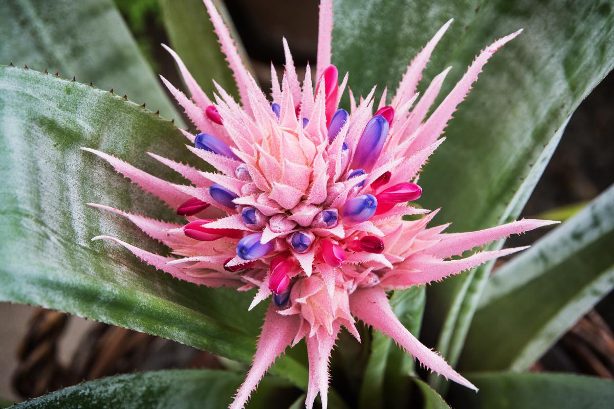 Existen muchos tipos de bromelias, dentro de las que la piñuela es una de las más populares. Tiene hojas cubiertas por un polvillo blanquecino, y las flores son una espiga grande de color rosa pastel que da mucha vida a los espacios.