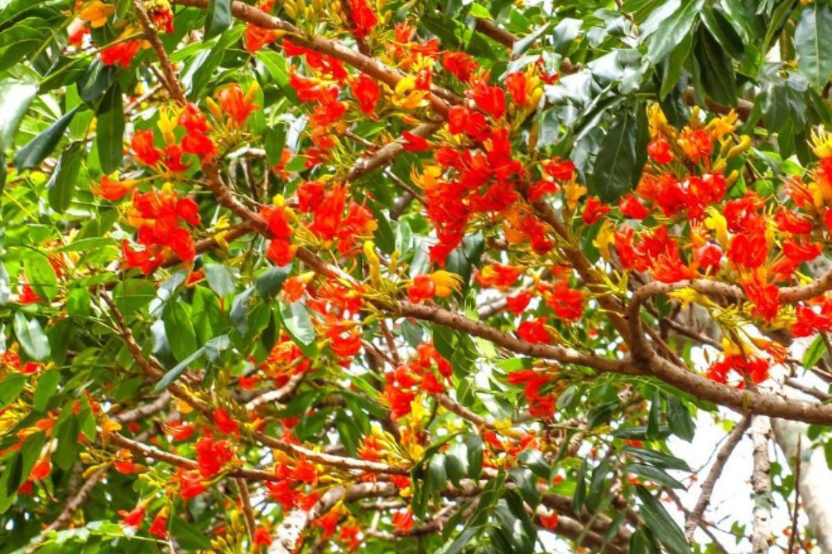 El Castanospermum australe no es realmente un castaño, pese a su nombre popular. Es un árbol nativo de Australia de hoja perenne o semiperenne en climas fríos, que puede llegar a alcanzar alturas de más de 20 metros y produce unas llamativas flores naranjas y amarillas.