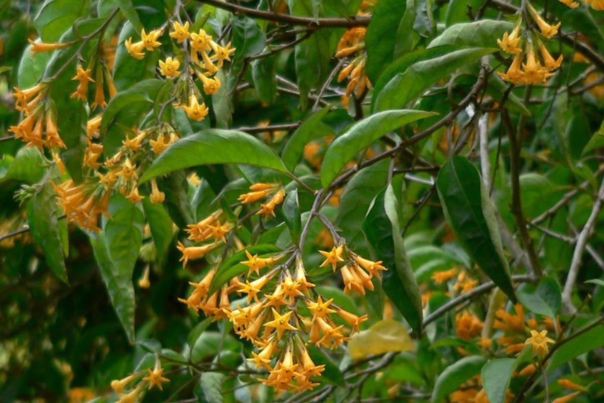 Pese a su nombre popular, estas flores anaranjadas no son en absoluto un jazmín. Su nombre científico es Cestrum aurantiacum y se trata de una especie invasora que tiene su origen en las Américas. Se trata de un arbusto que alcanza hasta los 3 metros de altura, que necesita de sol directo y ubicaciones ventiladas con aire limpio, por lo que no es apta para interiores. Produce unas bonitas flores naranjas con forma de estrella alargada, que acaban por abrirse por completo.
