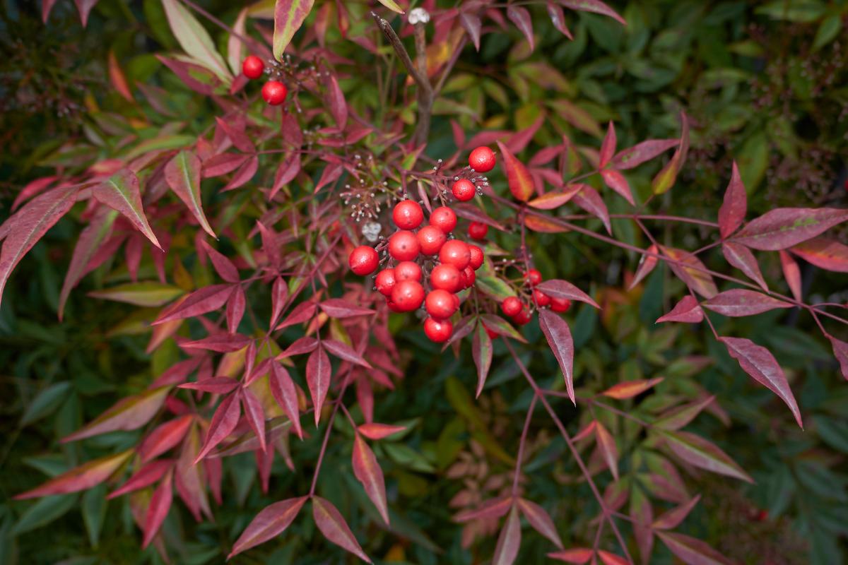 La Nandina domestica es una planta arbustiva que también se le llama bambú sagrado. Es originaria del este de Asia, desde el Himalaya hasta Japón. Una curiosidad de esta planta es que todas sus partes son venenosas y, en el caso de ingerirla, podría ser fatal. Aún así, resulta inofensiva para humanos y es una muy buena opción a la hora de decorar los centro de mesa en estas épocas navideñas.