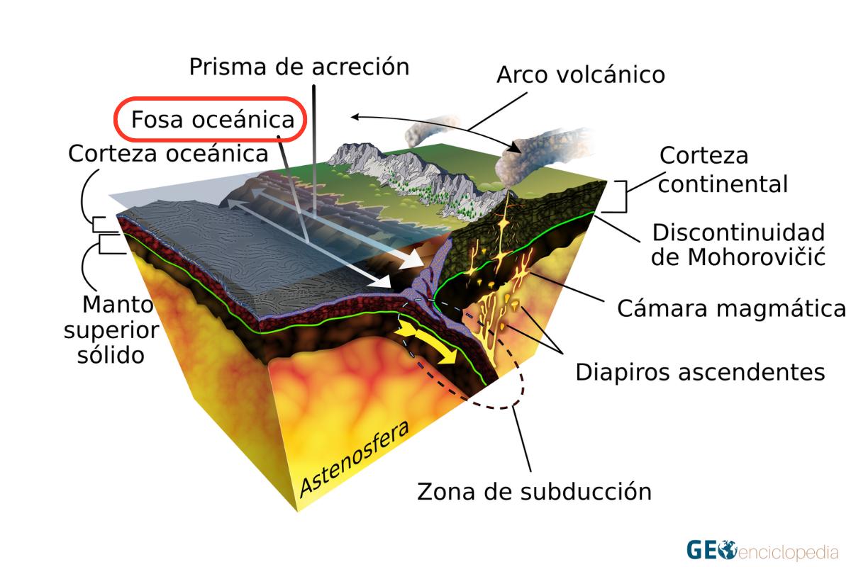 Las fosas oceánicas son estructuras geológicas presentes en límites convergentes donde una placa tectónica se hunde bajo otra en lugares conocidos como ambientes de subducción. La placa que se hunde, generalmente una placa oceánica más densa, se desliza debajo de una placa continental o de otra placa oceánica menos densa, y se sumerge en el manto terrestre.