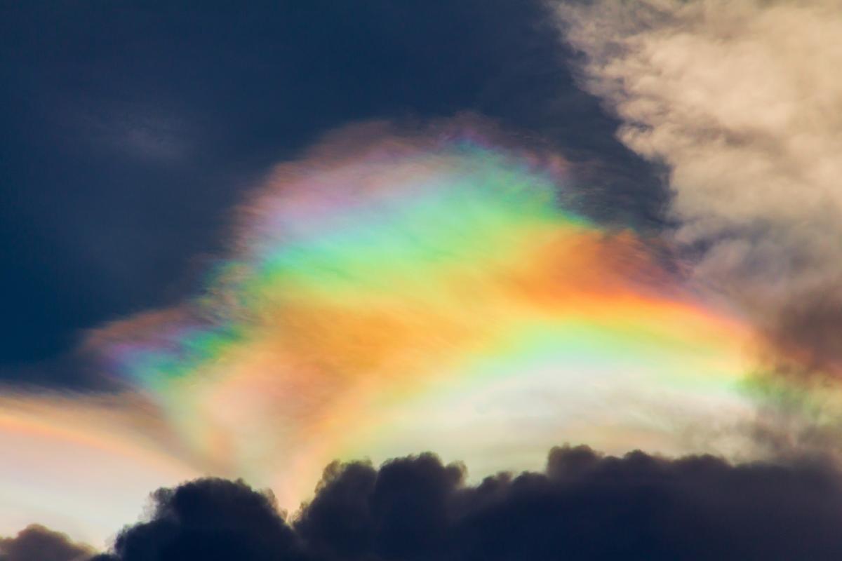La irisación de nubes es un fenómeno atmosférico sorprendente y relativamente raro que se caracteriza por la aparición de colores iridiscentes en las nubes. Estos colores pueden variar desde tonos suaves de rosa, azul y verde hasta colores más intensos y brillantes, y a menudo se presentan en forma de pequeñas franjas o manchas dispersas en la nube.