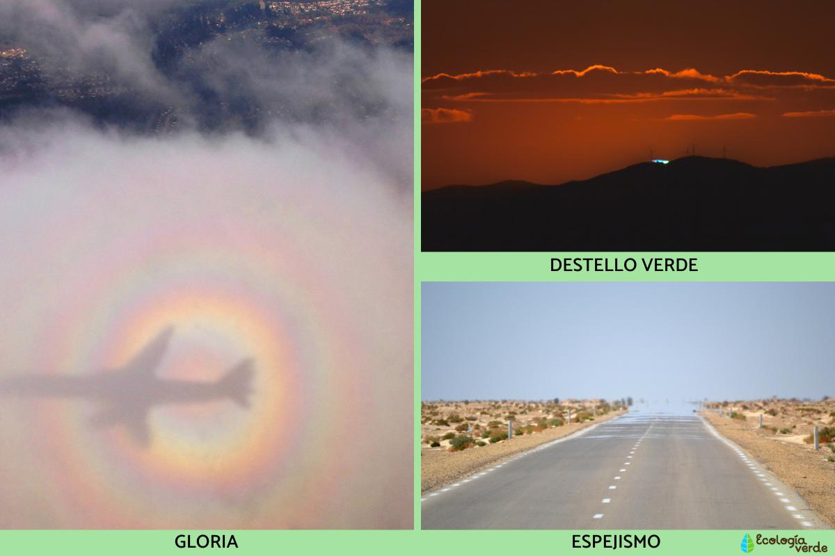 - Espejismo: es un fenómeno óptico en el que los objetos distantes aparecen distorsionados, desplazados, elevados o incluso invertidos debido a la refracción de la luz en capas de aire de diferentes temperaturas en la atmósfera.