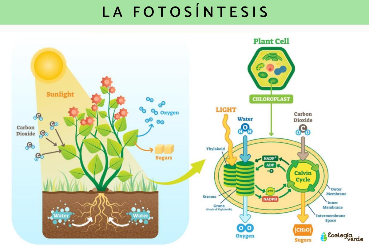 - Fotosíntesis: en la etapa propia de la fotosíntesis es donde se lleva a cabo el proceso de transformar agua, dióxido de carbono y luz en energía para la planta. Es un proceso muy complejo en el que pueden diferenciarse dos grandes fases de la fotosíntesis: la fase luminosa y la fase oscura. En la fase luminosa, la planta utiliza la energía lumínica para convertir las moléculas de CO2 y H2O en ATP, una unidad básica de energía bioquímica que todos los seres vivos usamos. Los responsables de esto son los cloroplastos, unos orgánulos que cuentan con su propio ADN y están presentes en todos los seres vivos capaces de llevar a cabo el proceso de fotosíntesis gracias a la clorofila que contienen, que les da a las plantas su color verde característico. Aquí puedes aprender más sobre Qué es la clorofila y sus tipos. En la fase oscura, el ATP producido en la fase luminosa se transforma en materia orgánica, en un proceso químico complejo que ya no necesita de luz.