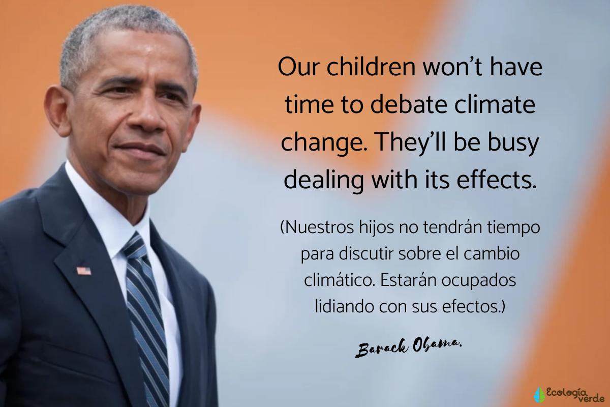- "Our children won't have time to debate climate change. They'll be busy dealing with its effects." Barack Obama. (Nuestros hijos no tendrán tiempo para discutir sobre el cambio climático. Estarán ocupados lidiando con sus efectos.)