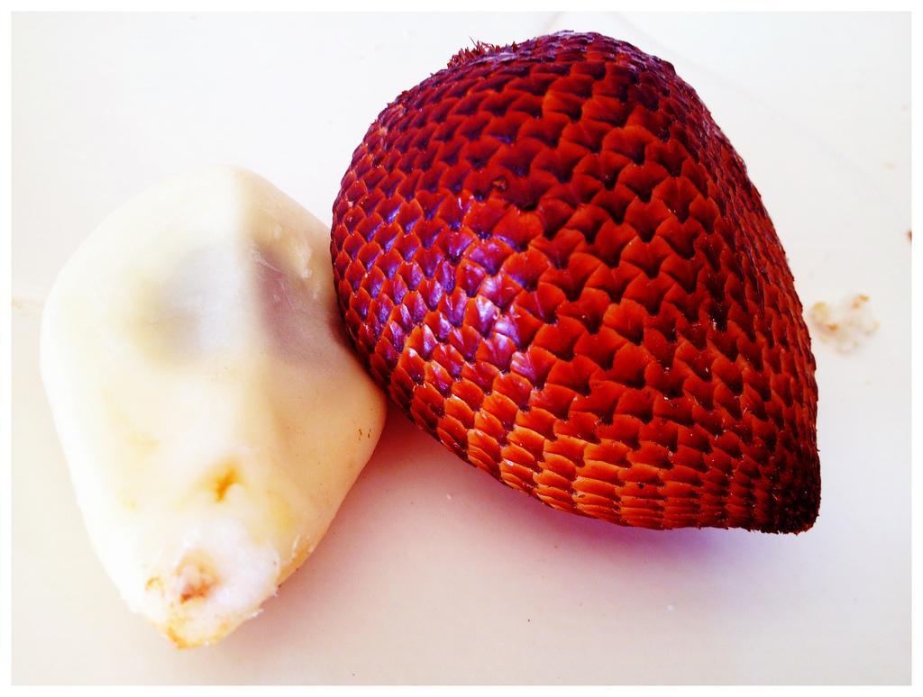 Se la llama así porque su cáscara presenta una apariencia que podría recordar a la piel de una serpiente. Procede de una especie de palmera de zonas tropicales. Su sabor es similar al de una piña y su fruto es blando y blanco.