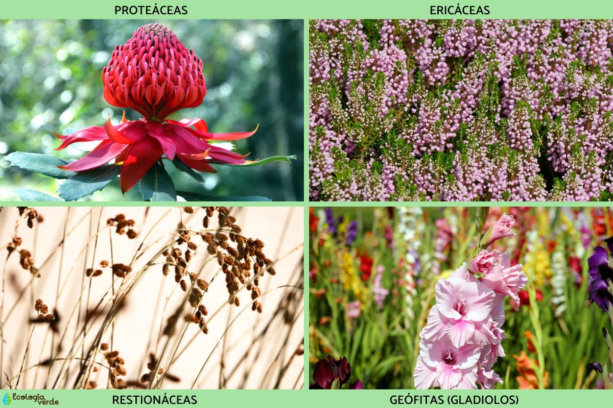 La flora del fynbos es uno de los aspectos más complejos de este ecosistema, destacándose por su diversidad, adaptaciones y belleza. Estos son los principales grupos de planta que albergan en estos ecosistemas: