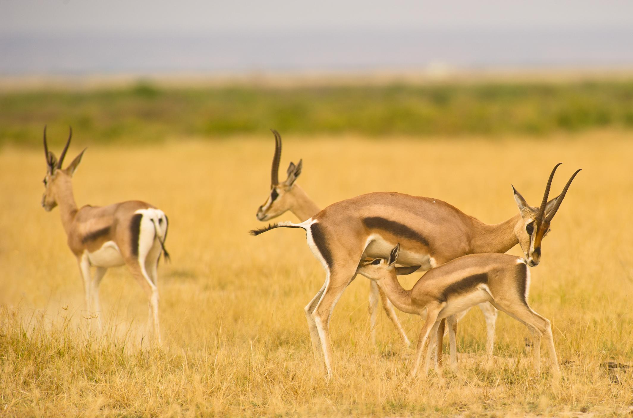 - La gacela de Thomson es de color marrón dorado con la parte inferior blanca y una característica franja negra en los costados de su cuerpo.