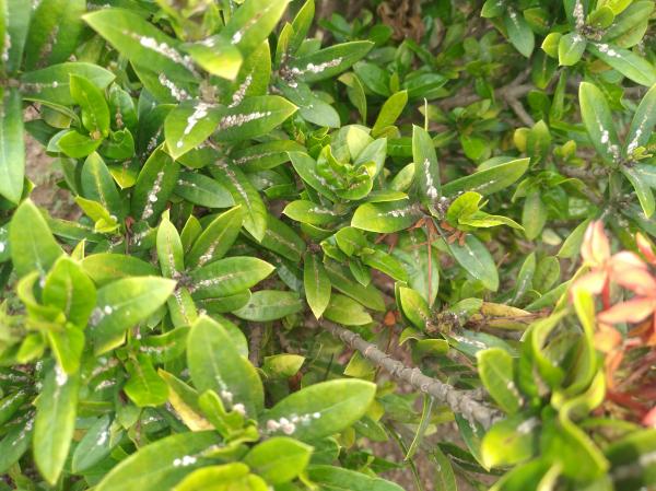 Hola escribo desde Panama, tengo estas manchitas blancas en mis ixoras rojas enanas,me gustaria saber si son huevecillos de algun insecto o si es alguna especie de hongos para poder aplicarle el quimico correcto....muchas gracias