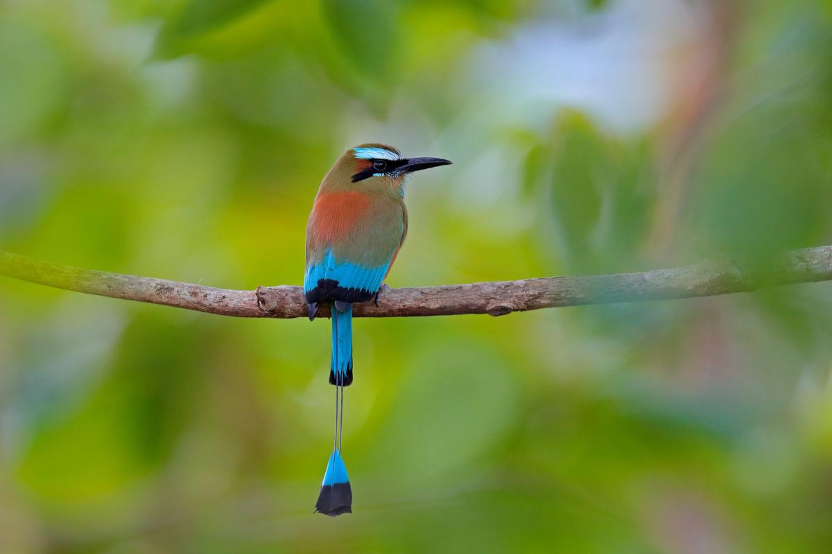 - Un rasgo especialmente llamativo es que tiene dos largas plumas que sobresalen de su cola, con raquis largo y desnudo, y una amplia pluma al final, lo cual le da una apariencia similar a dos grandes raquetas, como las que tienen otros momotos, pero en este caso, las astas de las plumas son más largas.