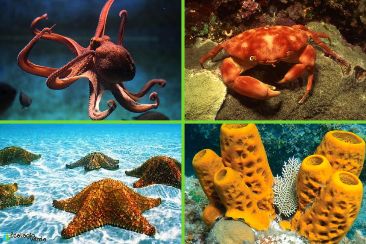 En contraposición a los vertebrados, los invertebrados no presentan una columna vertebral. Este grupo es megadiverso y muchos de ellos son de hábitos acuáticos como moluscos (como los caracoles o los pulpos), crustáceos (como los cangrejos), equinodermos (entre ellos la estrella de mar y el erizo), poríferos (como las esponjas marinas) y muchos más.