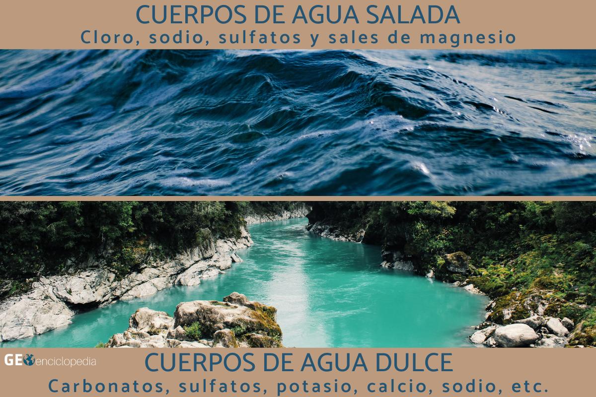 Por un lado, los mares y océanos presentan una salinidad media superior que otros cuerpos de agua. Sus sales principales son cloro, sodio y, en menor proporción, sulfatos y sales de magnesio.