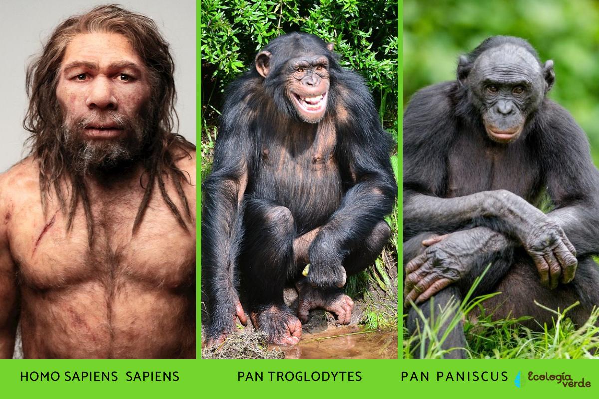 - Los simios antropoides y los homínidos: estos últimos provienen de un mismo ancestro común con origen de 6 millones de años atrás. Los homininos contienen varias especies que son nuestros ancestros. El Australopithecus fue el ancestro del género Homo y fue el primer bípedo, aunque todavía se parecía bastante a los grandes simios. A partir de él evolucionaron las siguientes especies de Homo como H. habilis, H. erectus o H. neanderthalensis, cada uno con características nuevas y más similares a las del hombre moderno.