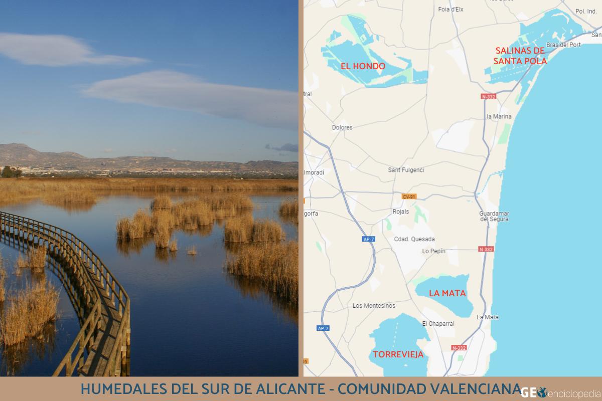 En la provincia de Alicante, Comunidad Valenciana, podemos encontrar tres humedales reconocidos por el convenio Ramsar: Parques Naturales de El Hondo, de las Salinas de Santa Pola y de las Lagunas de La Mata y Torrevieja. Este complejo de humedales incluye lagunas costeras, marismas y salinas.