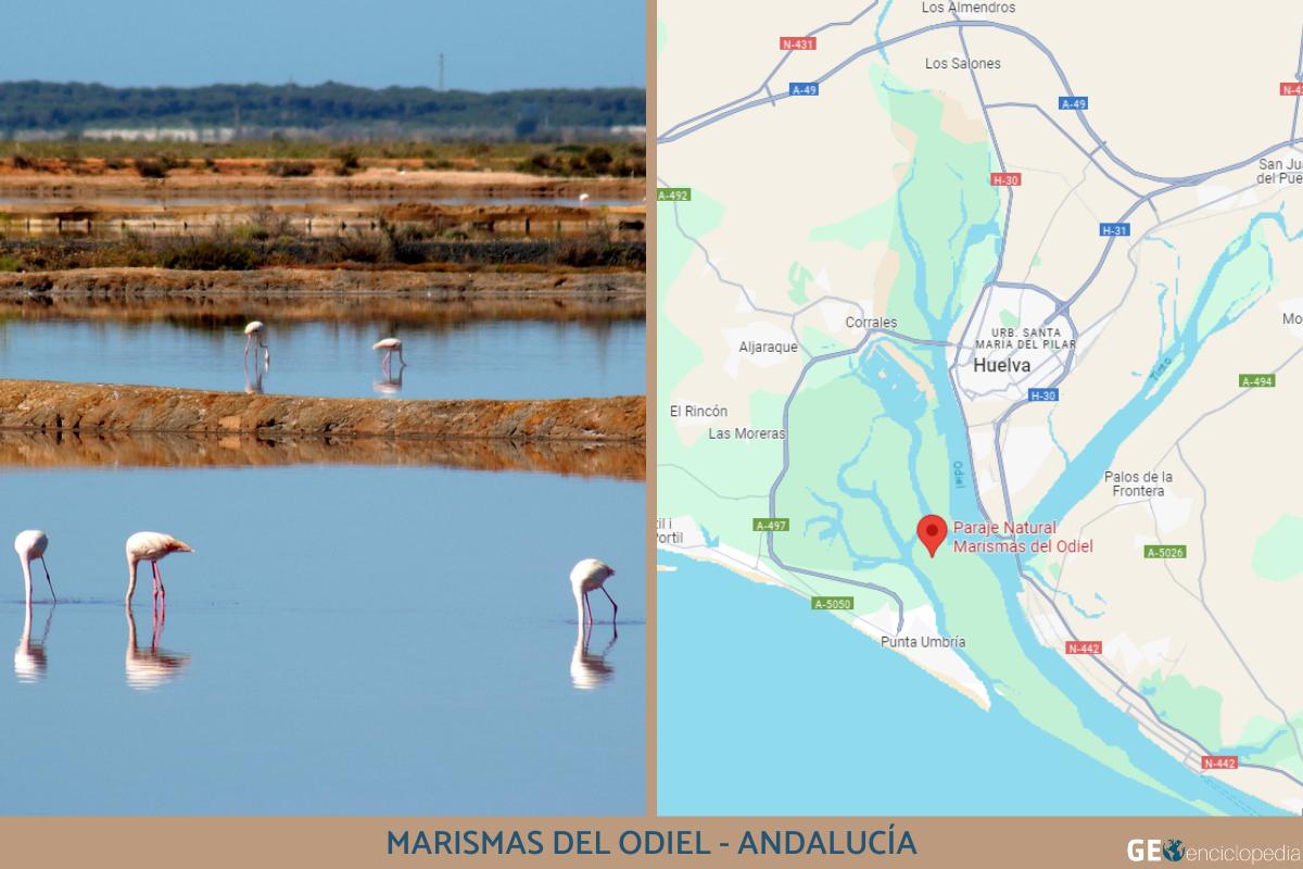 Las Marismas del Odiel se hallan en la provincia de Huelva, Andalucía. Estas marismas forman un importante humedal situado en la desembocadura de los ríos Tinto y Odiel, con una gran variedad de hábitats como marismas, esteros y salinas.