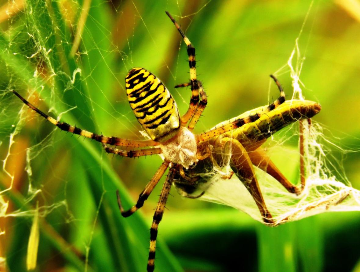 Especies como la araña tigre o la araña lobo, no son insectos sino arácnidos, pero los incluimos como parte del grupo de "bichos" buenos para el huerto. Estas arañas resultan totalmente inofensivas para las plantas de nuestro huerto, aunque no así para las plagas que se atrevan a adentrarse en sus dominios. Algunas cazan usando grandes telarañas mientras que otras se valen exclusivamente de su agilidad y fuerza, pero en cualquier caso son grandes aliadas del cultivo. No deben confundirse con la araña roja, una de las plagas más comunes, que se trata en realidad de un ácaro.