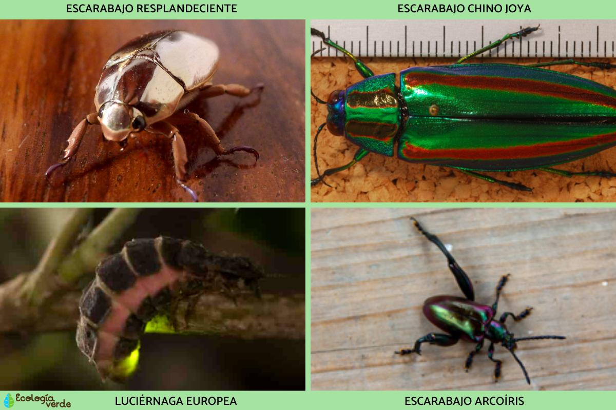 - Luciérnaga europea (Lampyris noctiluca): viven en los herbazales de Eurasia. La hembra no tiene alas y el macho sí, pero la hembra produce una luz verdosa para atraer pareja.