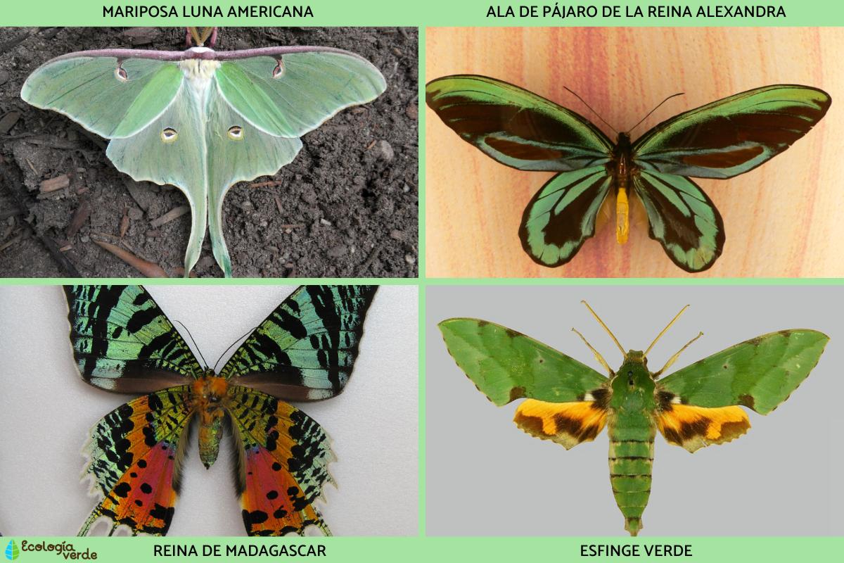 - Mariposa luna americana (Actias luna): son de color verde pastel y las alas son peculiares porque las anteriores terminan en una cola alargada. Cuando están en fase de oruga se alimentan de árboles caducifolios.