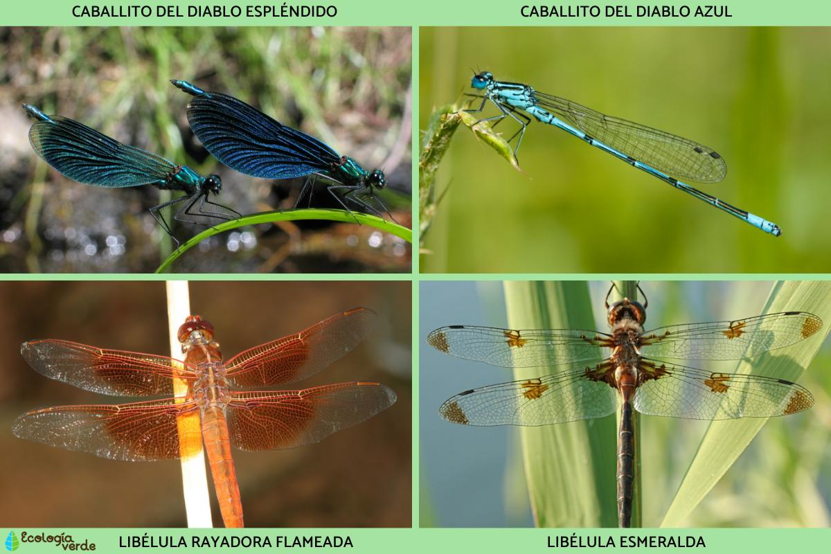 - Caballito del diablo espléndido (Calopteryx splendens): los machos tienen el cuerpo de un verde azul metálico muy llamativo, con alas amarillas y una mancha negra a la mitad, y las hembras son solamente verde metálico si mancha. Se encuentran al noroeste de Europa.