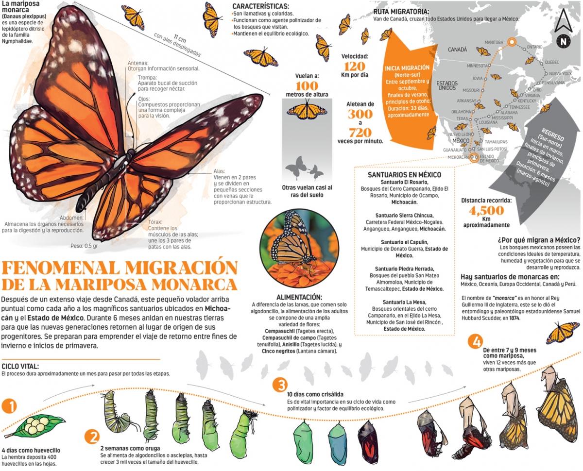 Durante la temporada de la migración de la mariposa monarca, esta recorre distancias que van desde 2.000 hasta más de 5.000 kilómetros. Su origen y su destino los podemos resumir así: