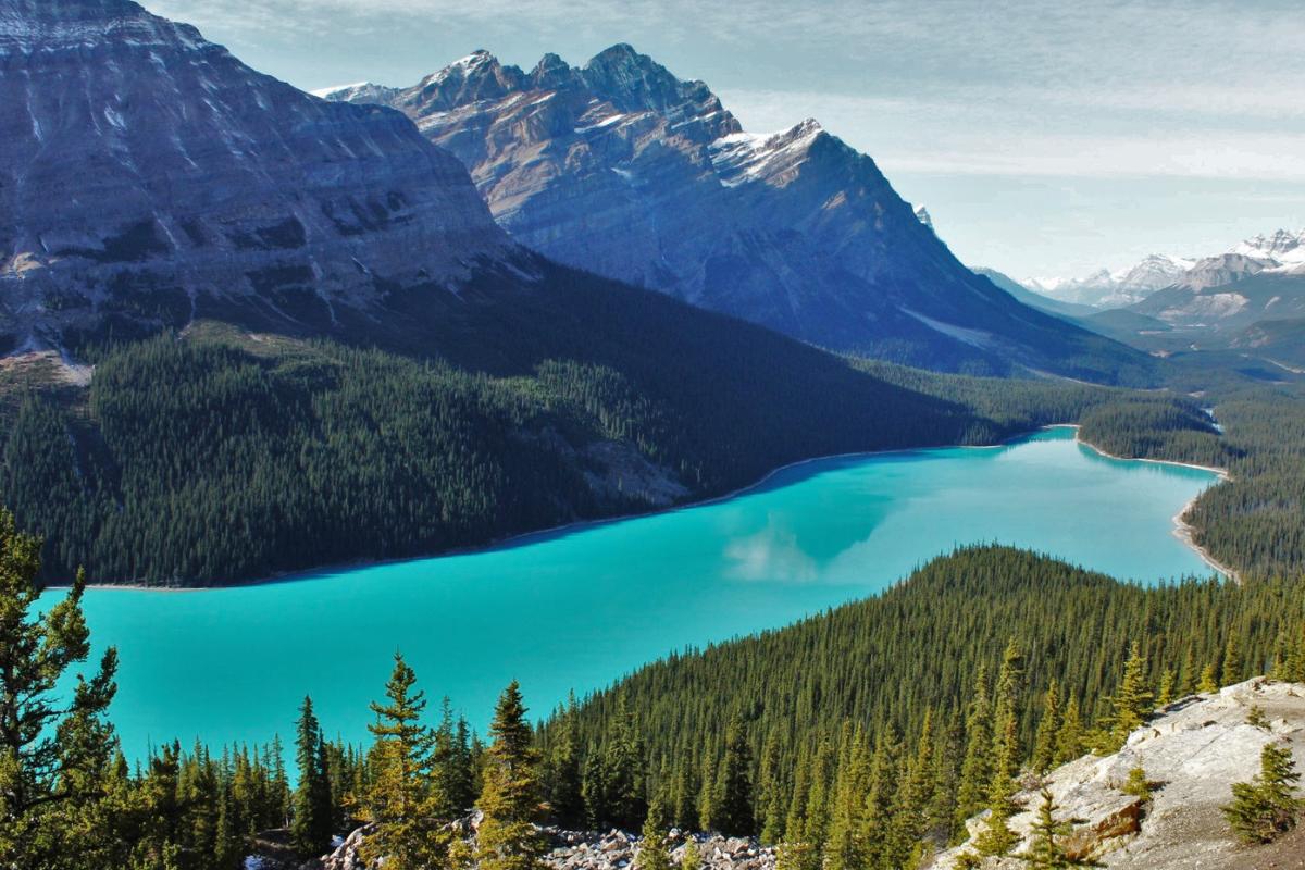- Lago Peyto: dentro del Parque Nacional Banff, en Alberta, se ubica este lago de origen glaciar que se alimenta del deshielo del glaciar Peyto. Tiene una superficie de aproximadamente 5,3 km² y es famoso por su forma de cabeza de lobo cuando se lo observa desde ciertos miradores. Posee un intenso color turquesa y conforma uno de los paisajes más fotografiados de las Montañas Rocosas canadienses.