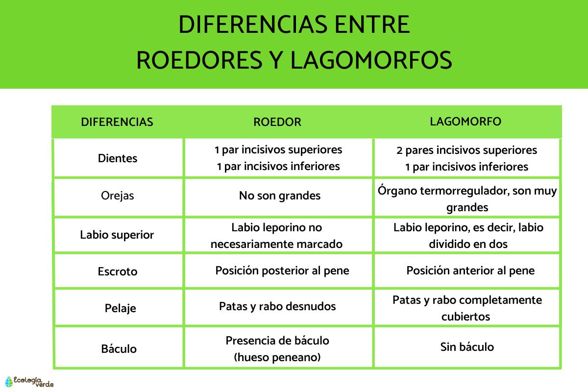 - Escroto: los lagomorfos presentan el escroto en posición anterior al pene, mientras que los roedores en la parte posterior.