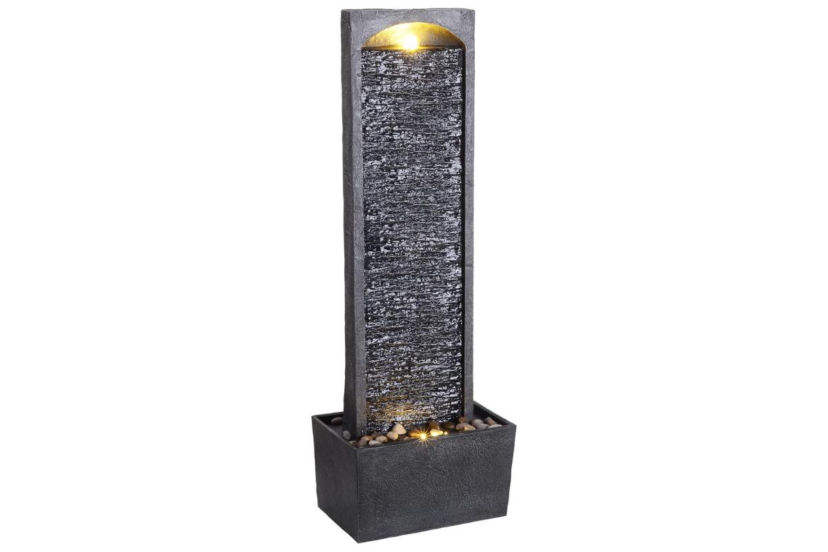 Esta fuente decorativa de diseño curvo aporta elegancia y serenidad a cualquier jardín, terraza o incluso interiores. Fabricada en poliresina resistente, cuenta con una repisa de pizarra natural que canaliza el agua a través de varios niveles, imitando el sonido relajante de una cascada. Su sistema autónomo con bomba silenciosa recircula el agua sin necesidad de toma fija, y la iluminación LED integrada añade un brillo acogedor al anochecer. Con 98 cm de altura, es perfecta como pieza central en espacios exteriores amplios.