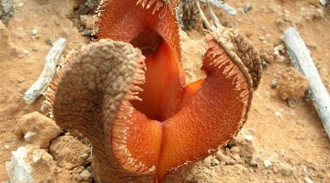 Otra de las plantas que huele fatal es la hydnora africana, que además sirve de cárcel a sus polinizadores. Se trata de una especie sin clorofila nativa del sur de África. La planta crece bajo tierra, a excepción de una flor carnosa que emerge sobre el suelo y emite un olor de heces para también atraer a sus polinizadores naturales.