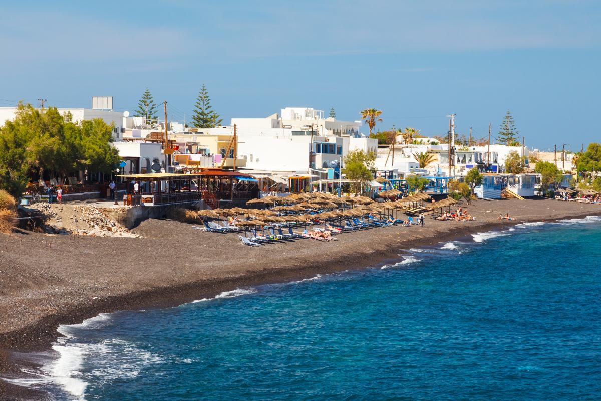Kamari, en la isla de Santorini, es una playa de arena negra formada por la actividad volcánica de la caldera de Santorini. Bañada por el Mar Egeo, Kamari es una playa organizada con sombrillas y numerosos bares y restaurantes. La flora es escasa debido al entorno volcánico, pero la fauna marina es diversa, con oportunidades para buceo y snorkel. Las vistas del Mar Egeo y la montaña Mesa Vouno la convierten en un destino turístico destacado.