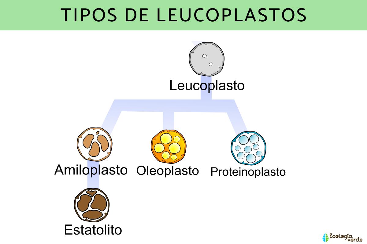Los leucoplastos se clasifican en tres tipos principales según la sustancia que almacenan: amiloplastos, elaioplastos (u oleoplastos) y proteinoplastos.