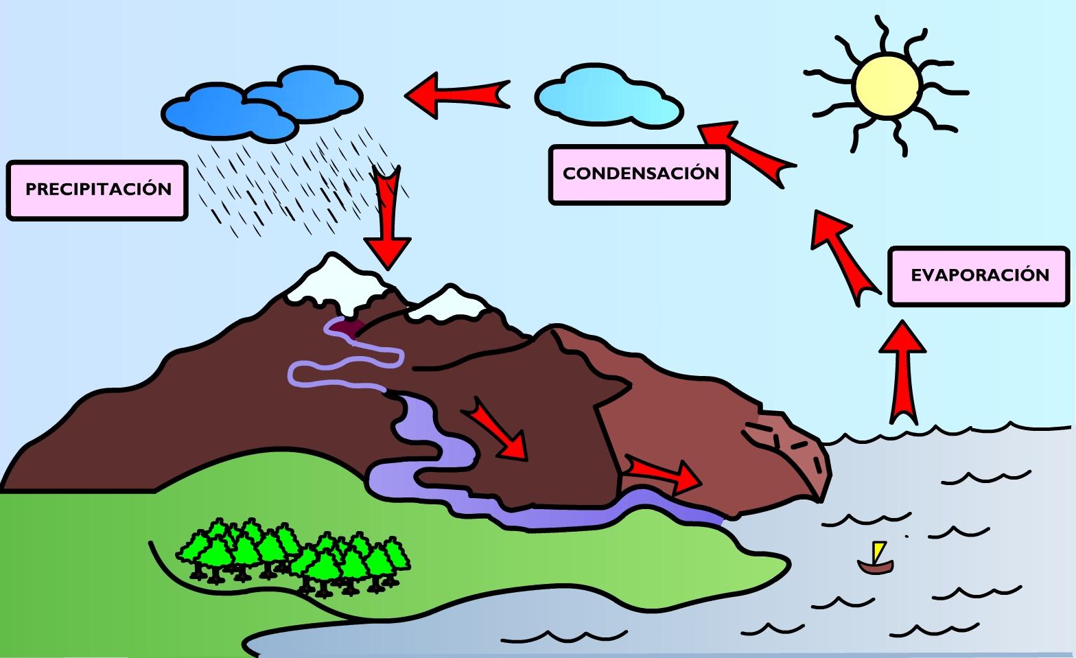 - Precipitación: las gotas caen en forma de lluvia (o en otros tipos de precipitación como nieve, dependiendo de la temperatura) y llegan a la superficie terrestre.